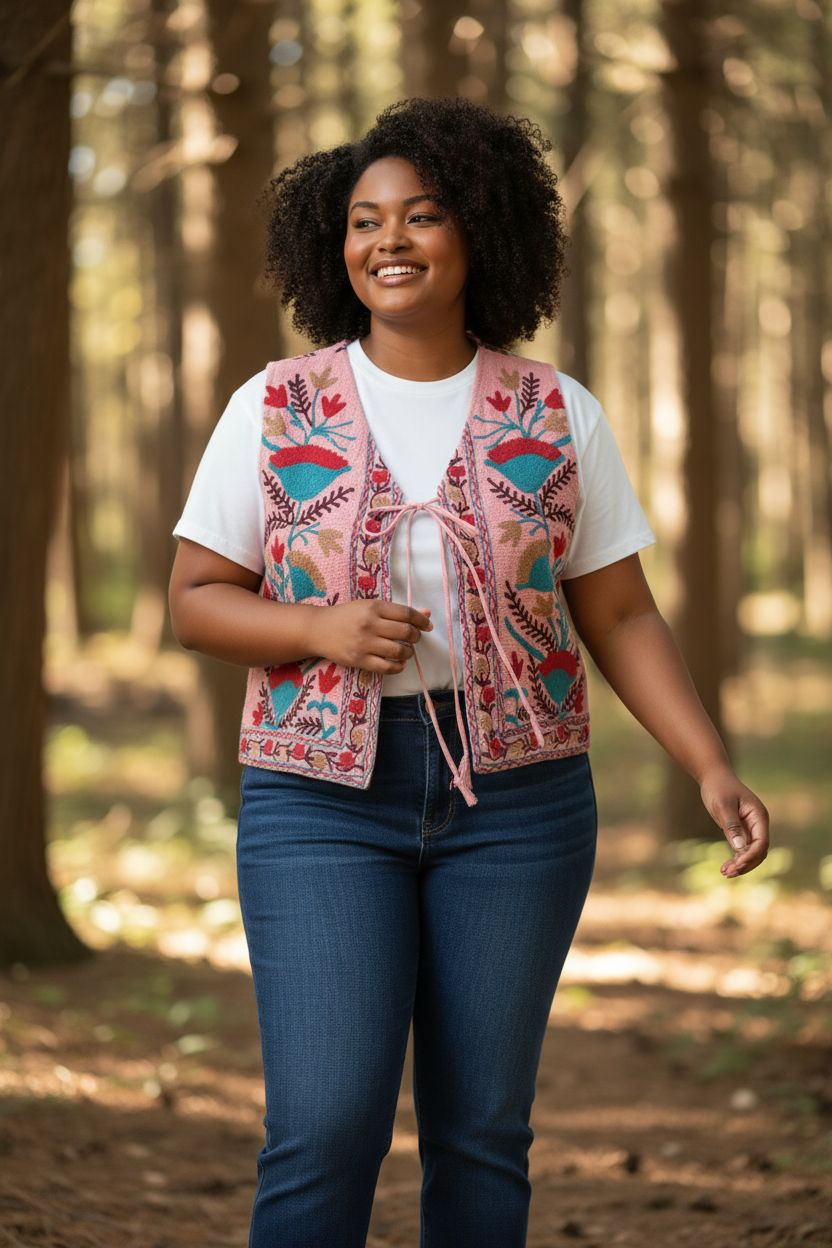 Onze mouwloze Suzani jacks zijn handgeborduurd en uniek in kleur en patroon.