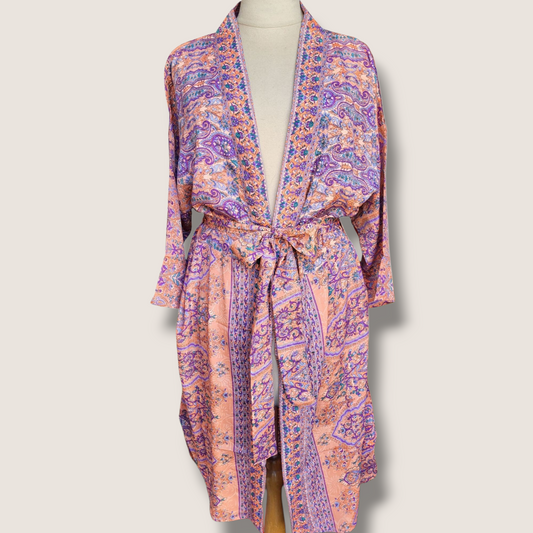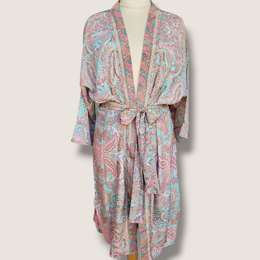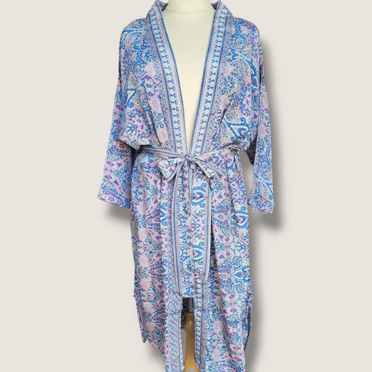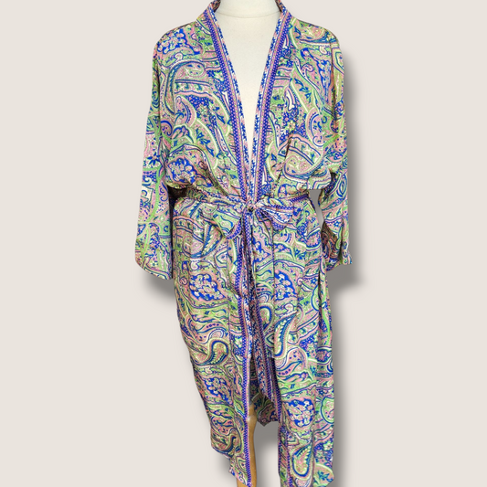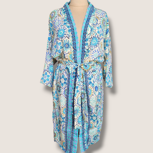 Onze kimono collectie is een eerbetoon aan vrouwelijkheid, vakmanschap en verfijning. 🧵 Elk stuk is met de hand gemaakt in India, van een zachte en duurzame mix van 70% zijde en 30% polyester. De stoffen vallen soepel om het lichaam en geven je outfit direct een unieke, elegante touch. 💫