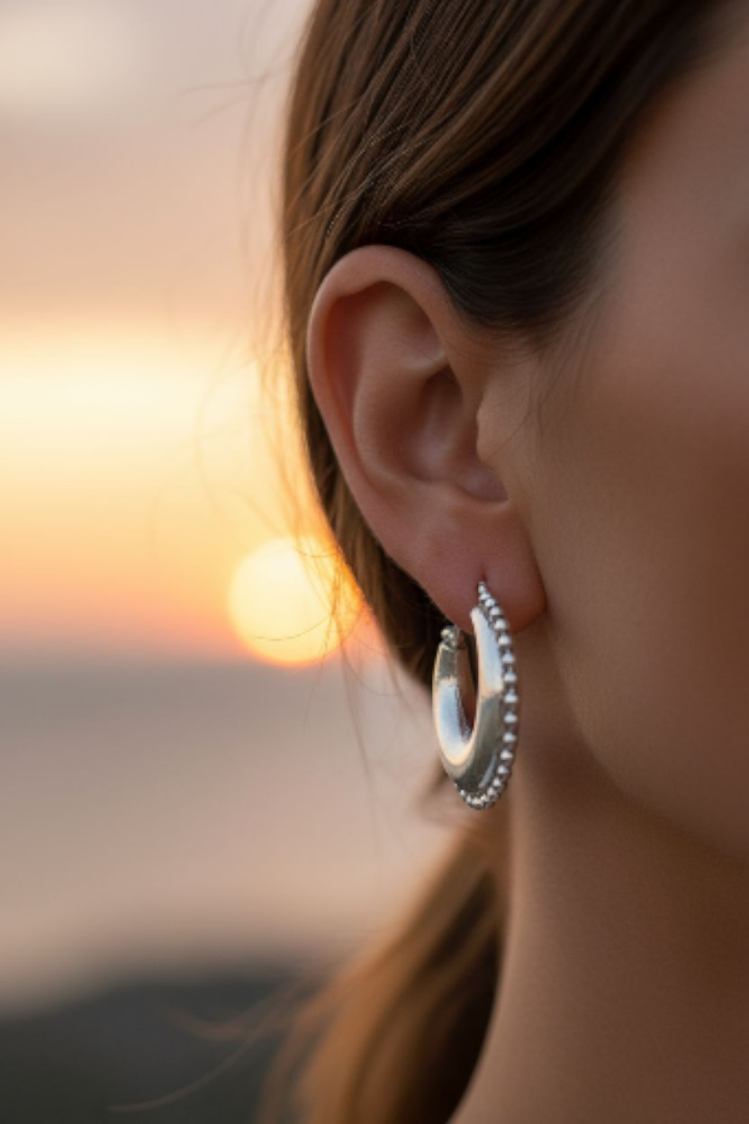 De fijne bolletjesrand geeft de oorbel een speelse, handgemaakte uitstraling die moeiteloos past bij zowel een casual outfit als een feestelijke look.