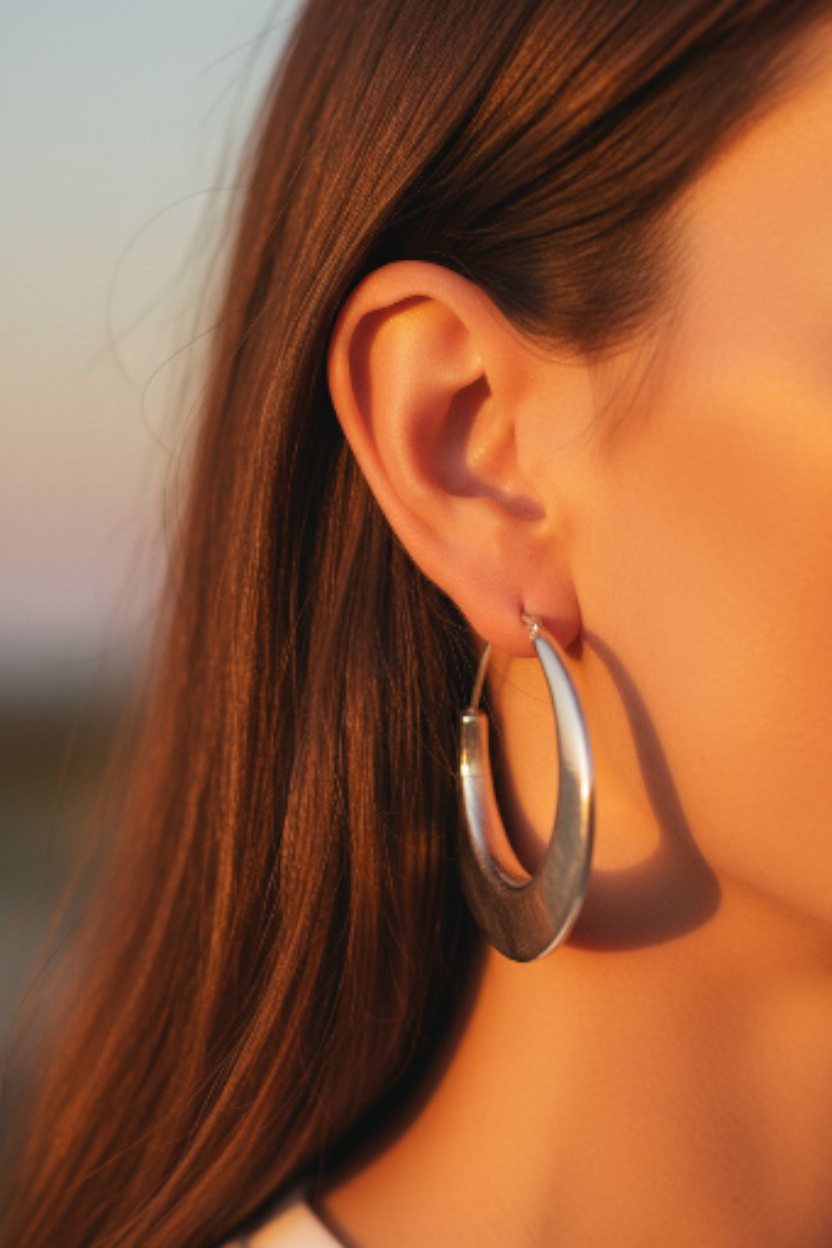 Het strakke, vloeiende ontwerp geeft een moderne twist aan de klassieke creool, stijlvol bij zowel een casual outfit als een chique avondlook.
