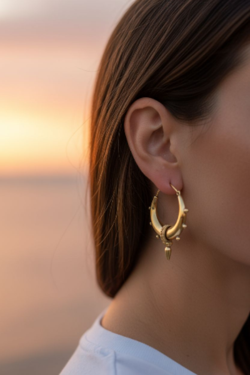Deze prachtig gevormde oorbellen zijn een moderne interpretatie van klassieke Indiase designs. De unieke halvemaanvorm, afgewerkt met subtiele bolletjes en een verfijnd druppeldetail, geeft ze een krachtige boho-chique uitstraling die meteen opvalt.