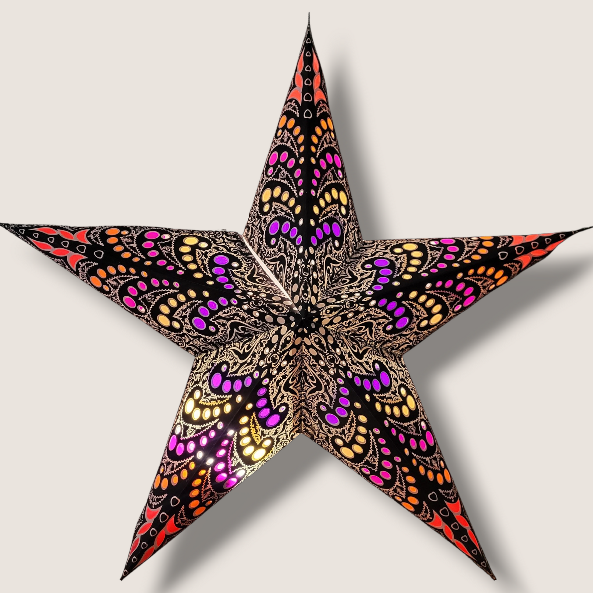 Onze papieren sterren van 60 cm doorsnede worden met de hand gemaakt in India . Een prachtig ambacht dat vakmanschap, creativiteit en traditie samenbrengt. Elke ster begint als een vel fijn, sterk tissuepapier dat zorgvuldig wordt uitgesneden, geperforeerd en bedrukt met kleurrijke patronen.
