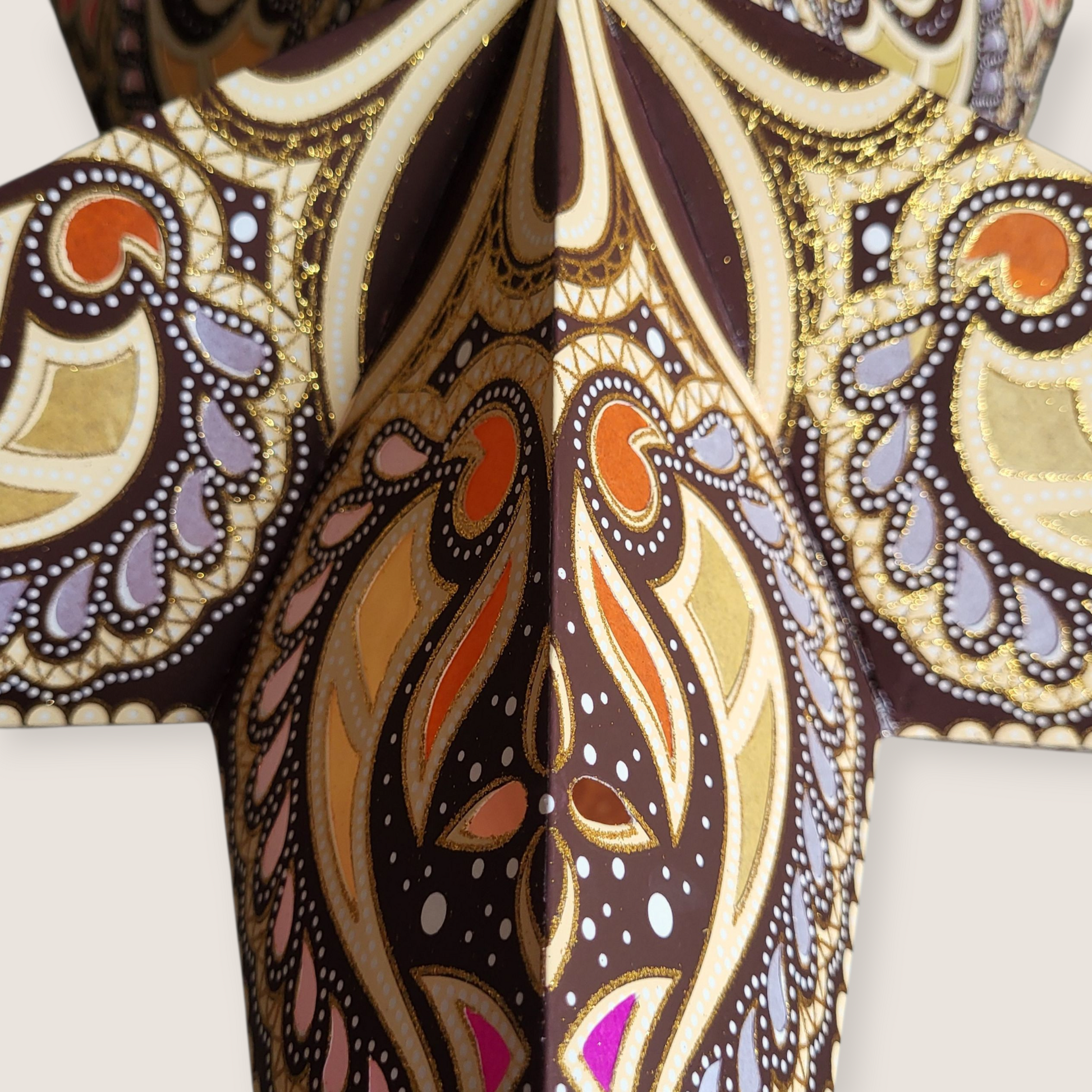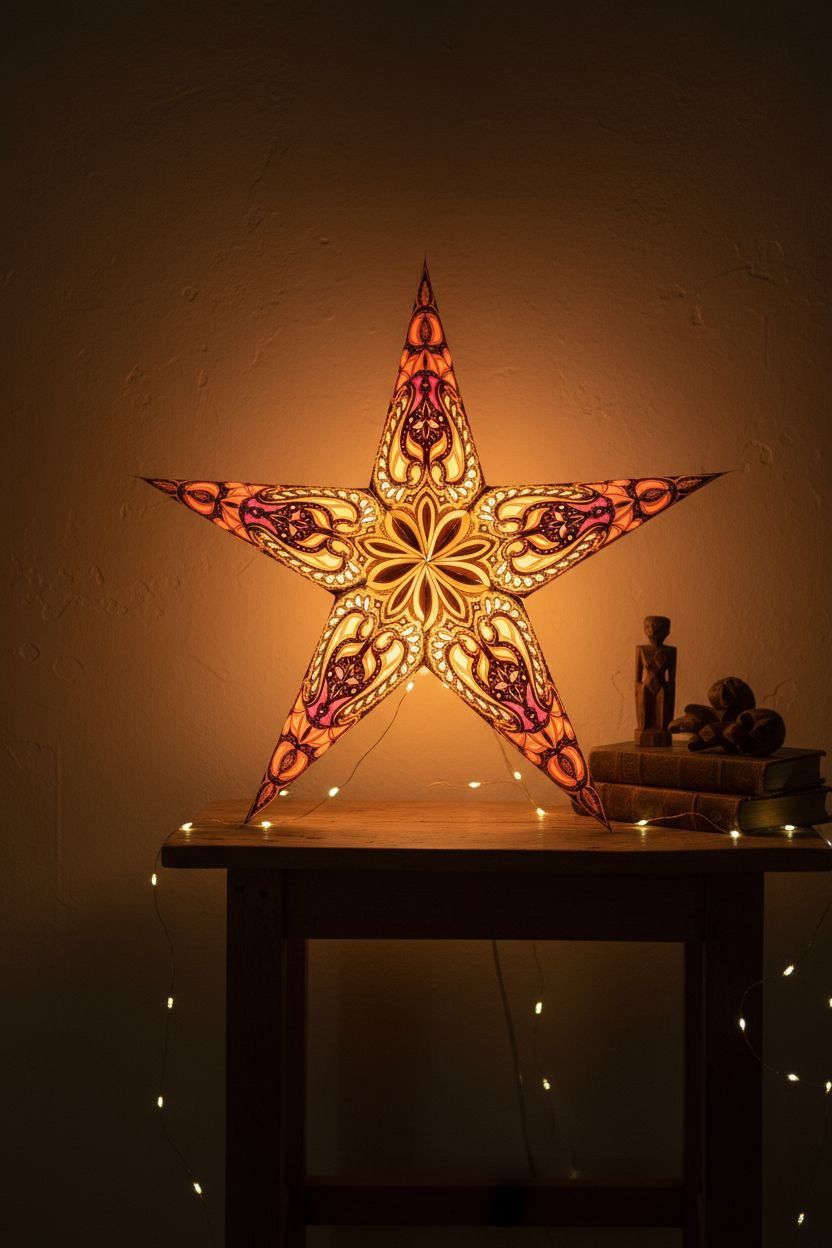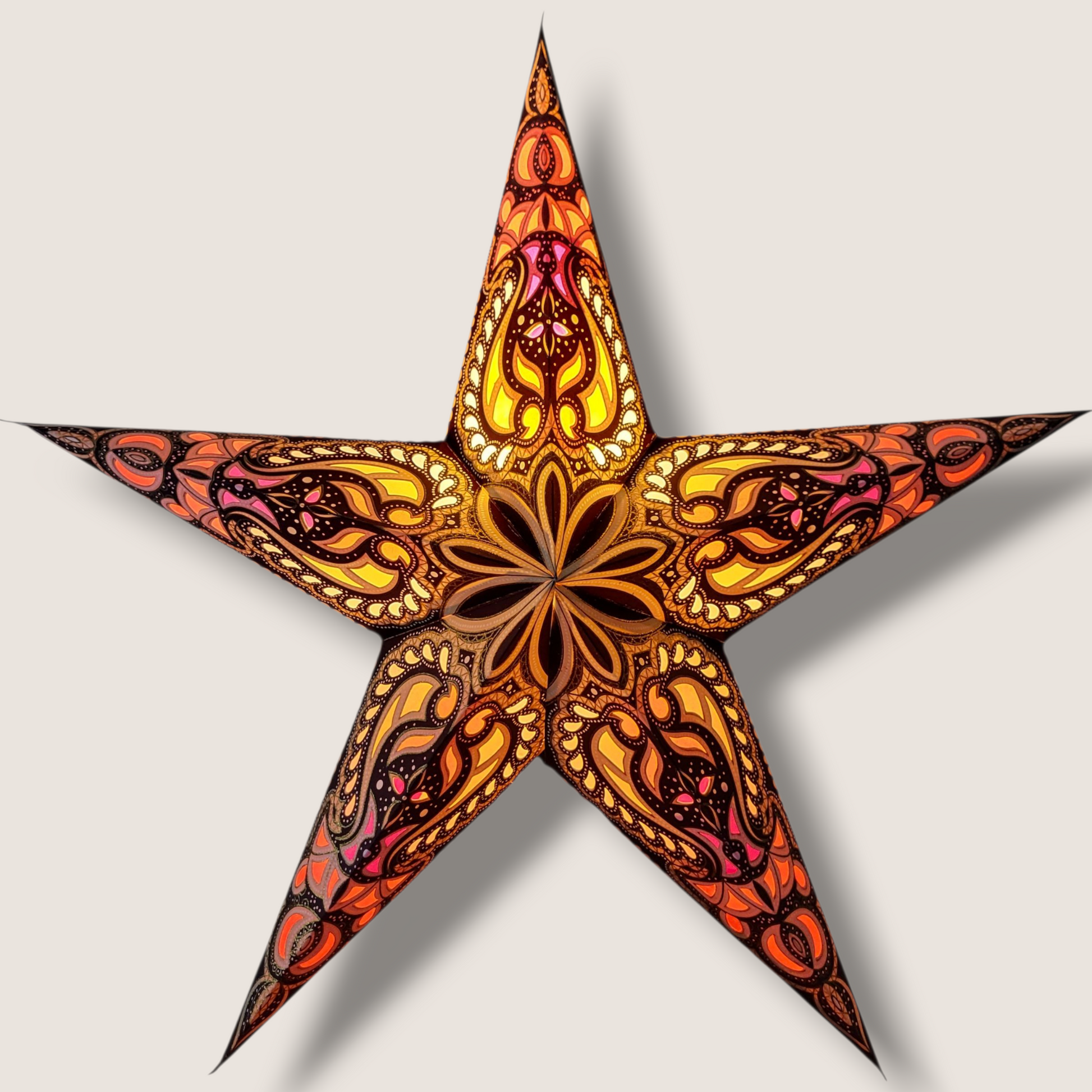 Onze papieren sterren van 60 cm doorsnede worden met de hand gemaakt in India . Een prachtig ambacht dat vakmanschap, creativiteit en traditie samenbrengt. Elke ster begint als een vel fijn, sterk tissuepapier dat zorgvuldig wordt uitgesneden, geperforeerd en bedrukt met kleurrijke patronen.