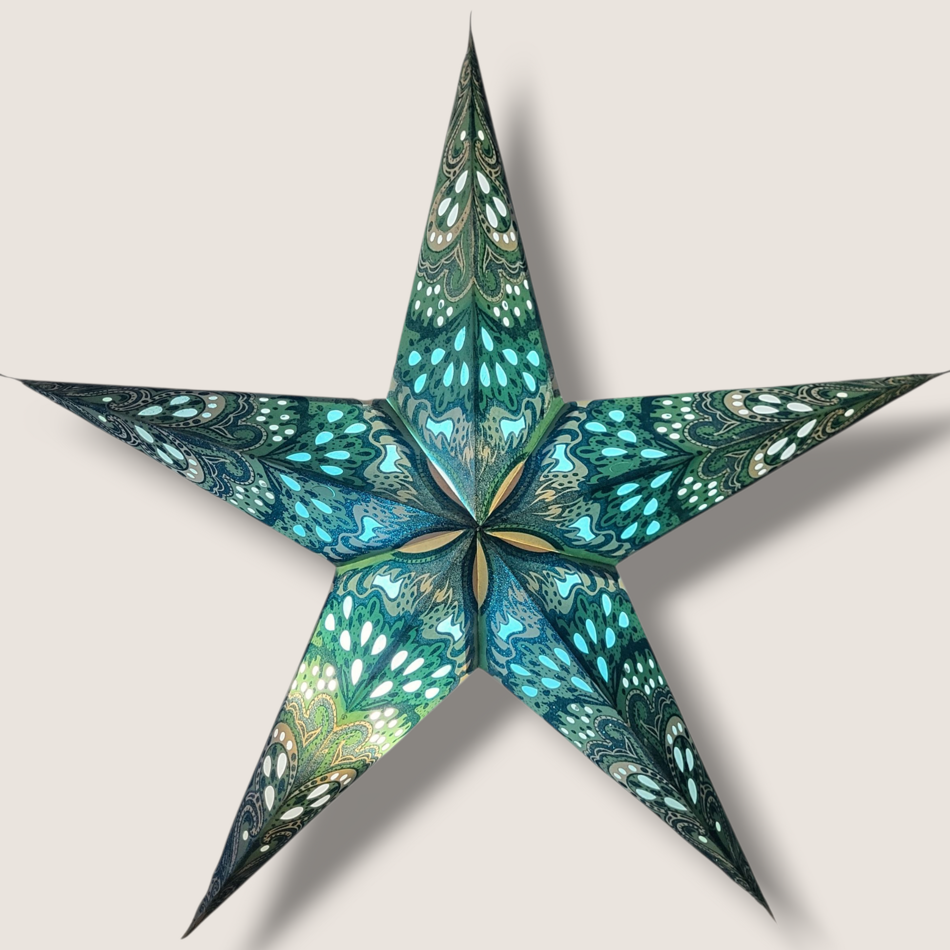 Onze papieren sterren van 60 cm doorsnede worden met de hand gemaakt in India . Een prachtig ambacht dat vakmanschap, creativiteit en traditie samenbrengt. Elke ster begint als een vel fijn, sterk tissuepapier dat zorgvuldig wordt uitgesneden, geperforeerd en bedrukt met kleurrijke patronen.
