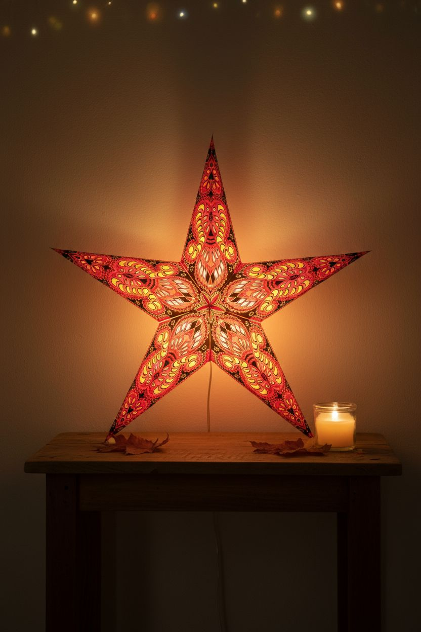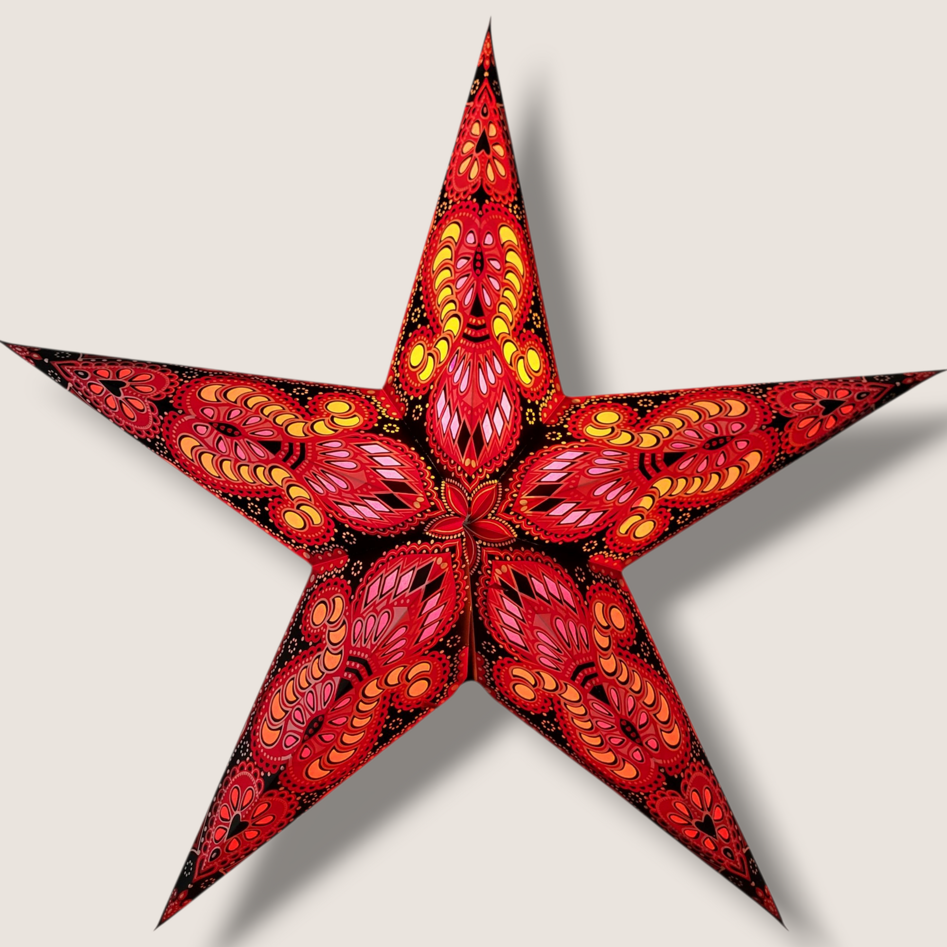 Onze papieren sterren van 60 cm doorsnede worden met de hand gemaakt in India . Een prachtig ambacht dat vakmanschap, creativiteit en traditie samenbrengt. Elke ster begint als een vel fijn, sterk tissuepapier dat zorgvuldig wordt uitgesneden, geperforeerd en bedrukt met kleurrijke patronen.