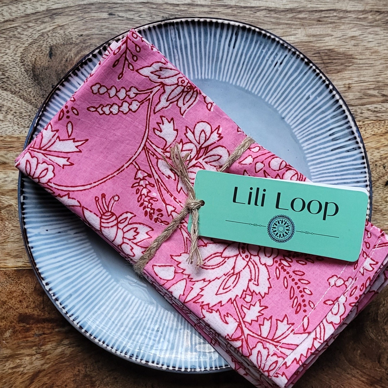🌸 Lili Loop – Hand Blockprint Servetten – Pink Blossom (set van 6) 🌸