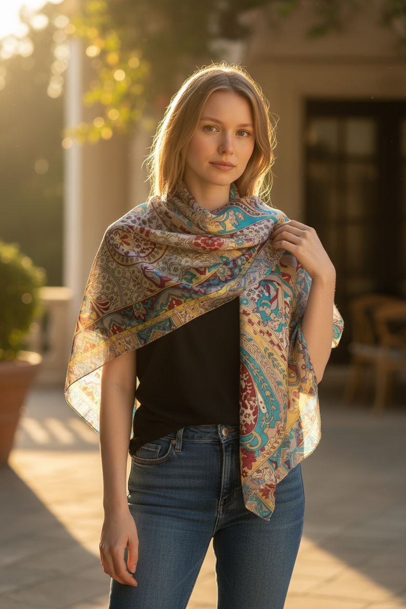 Elke sjaal vertelt een verhaal van vakmanschap en verfijning, rechtstreeks uit India, waar traditionele technieken samenkomen met moderne kleuren en patronen.