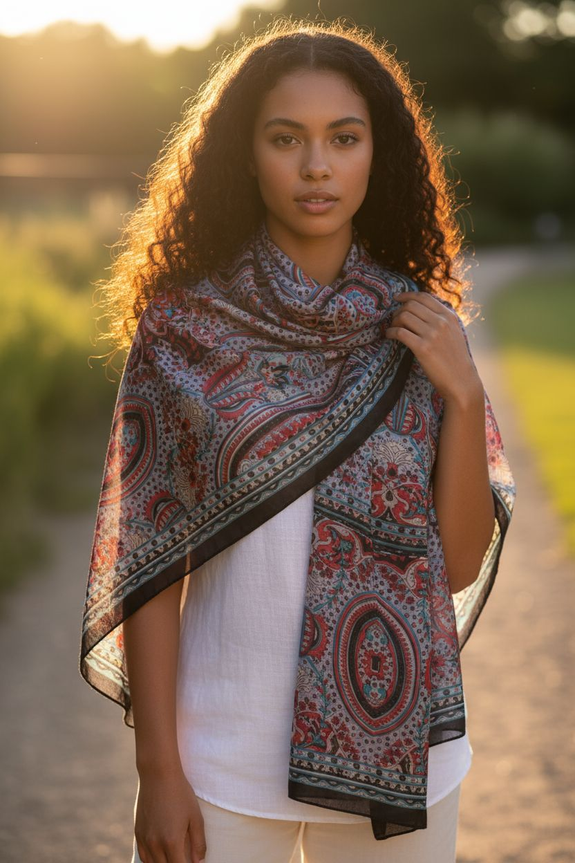 Elke sjaal vertelt een verhaal van vakmanschap en verfijning, rechtstreeks uit India, waar traditionele technieken samenkomen met moderne kleuren en patronen.